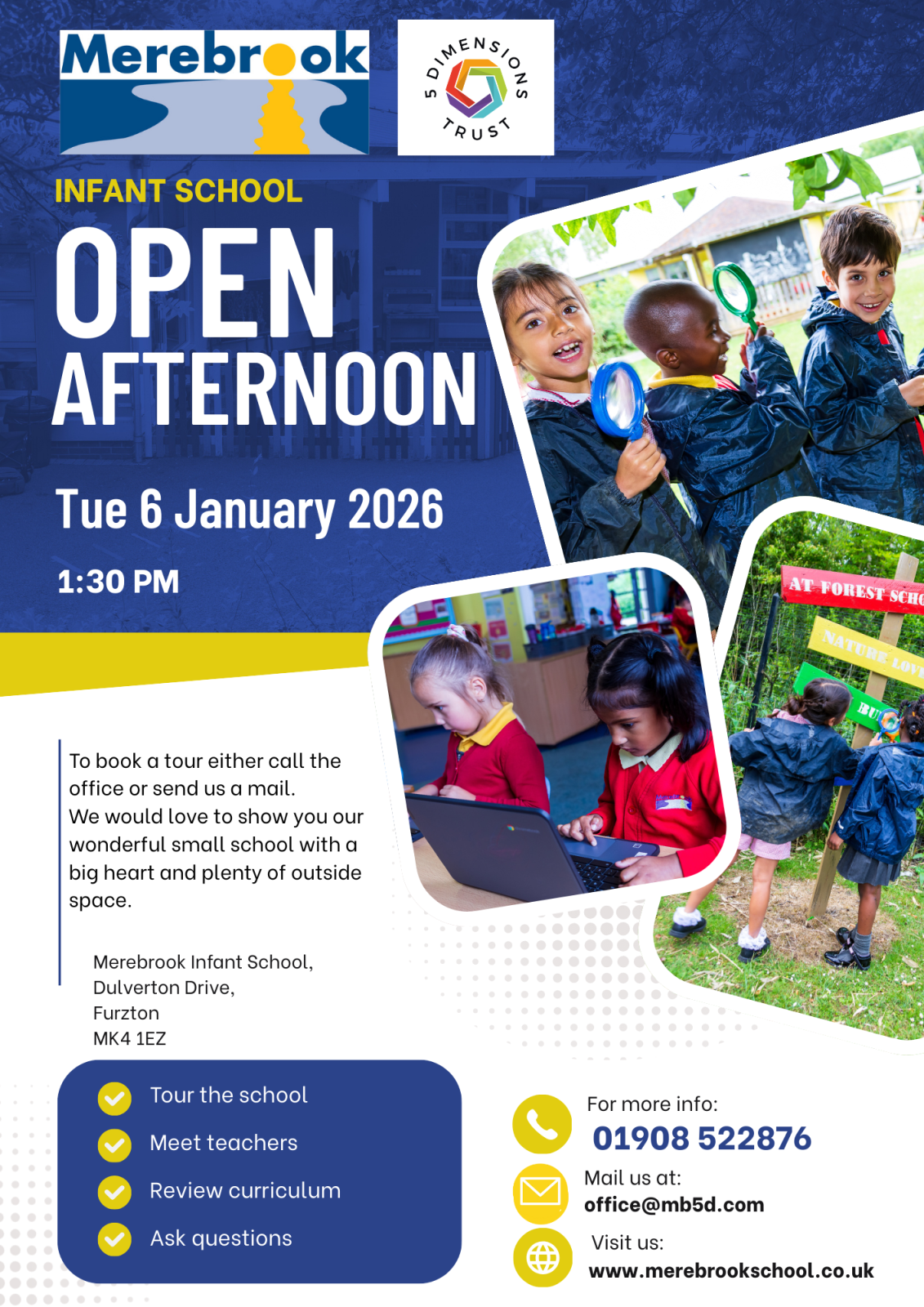 Welcome to Merebrook Infant School and our school website. At Merebrook Infant School, we encourage all of our children to aspire to be independent, resilient, lifelong learners who have the skills to adapt to the changing world around them. They have respect for each other, themselves and our community. To be the best they can be as global citizens, we aim to develop socially aware individuals who understand the impact they can have on others.